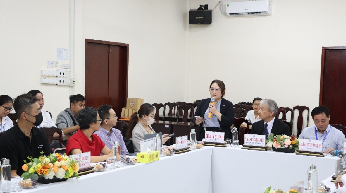 Bà Hui-Yu Hsu-đại diện Trung tâm IMSC Bệnh viện Đại học Y Cao Hùng, phát biểu tại buổi làm việc, đề xuất các nội dung trao đổi hợp tác trong tương lai giữa Bệnh viện Đại học Y Cao Hùng và Bệnh viện Trường Đại học Y Dược Cần Thơ