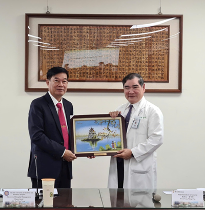 BS.CKII Lại Văn Nông Giám đốc Bệnh viện đại diện đoàn công tác Bệnh viện Trường Đại học Y Dược Cần Thơ tặng quà lưu niệm cho Bệnh viện Trường Đại học Y Trung Sơn – Giáo sư Tsai Ming-Che
