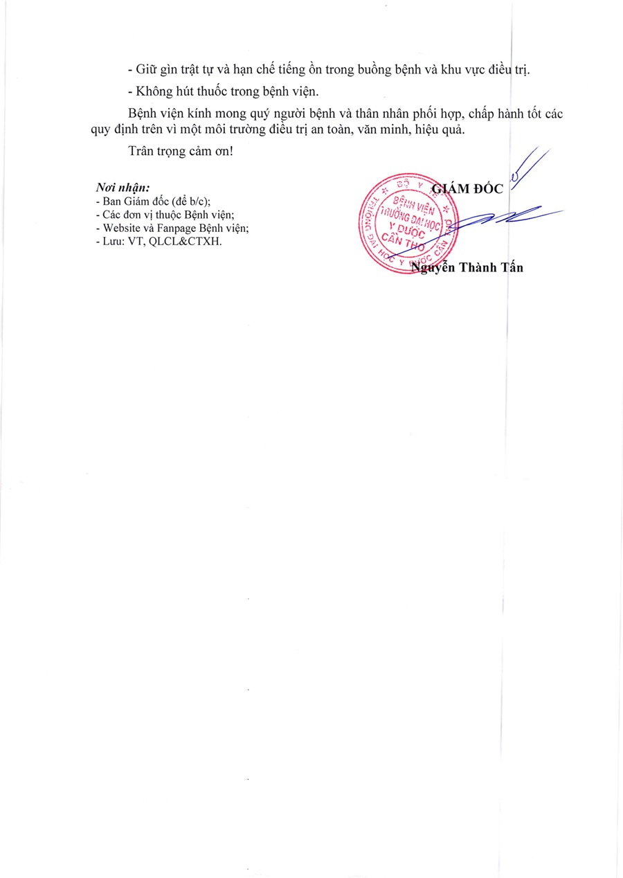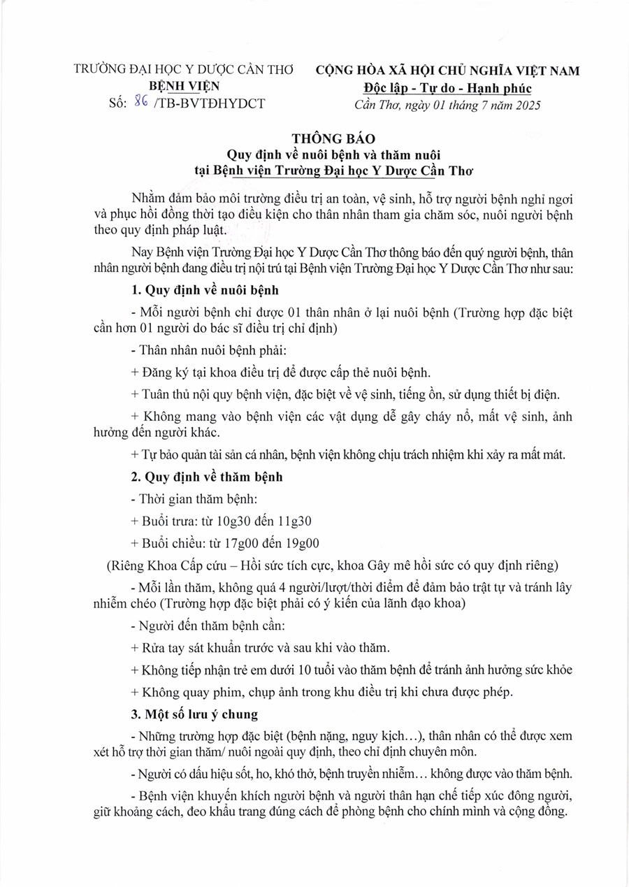 Thông báo số 86 Quy định về việc nuôi bệnh và thăm nuôi tại Bệnh viện Trường Đại học Y Dược Cần Thơ