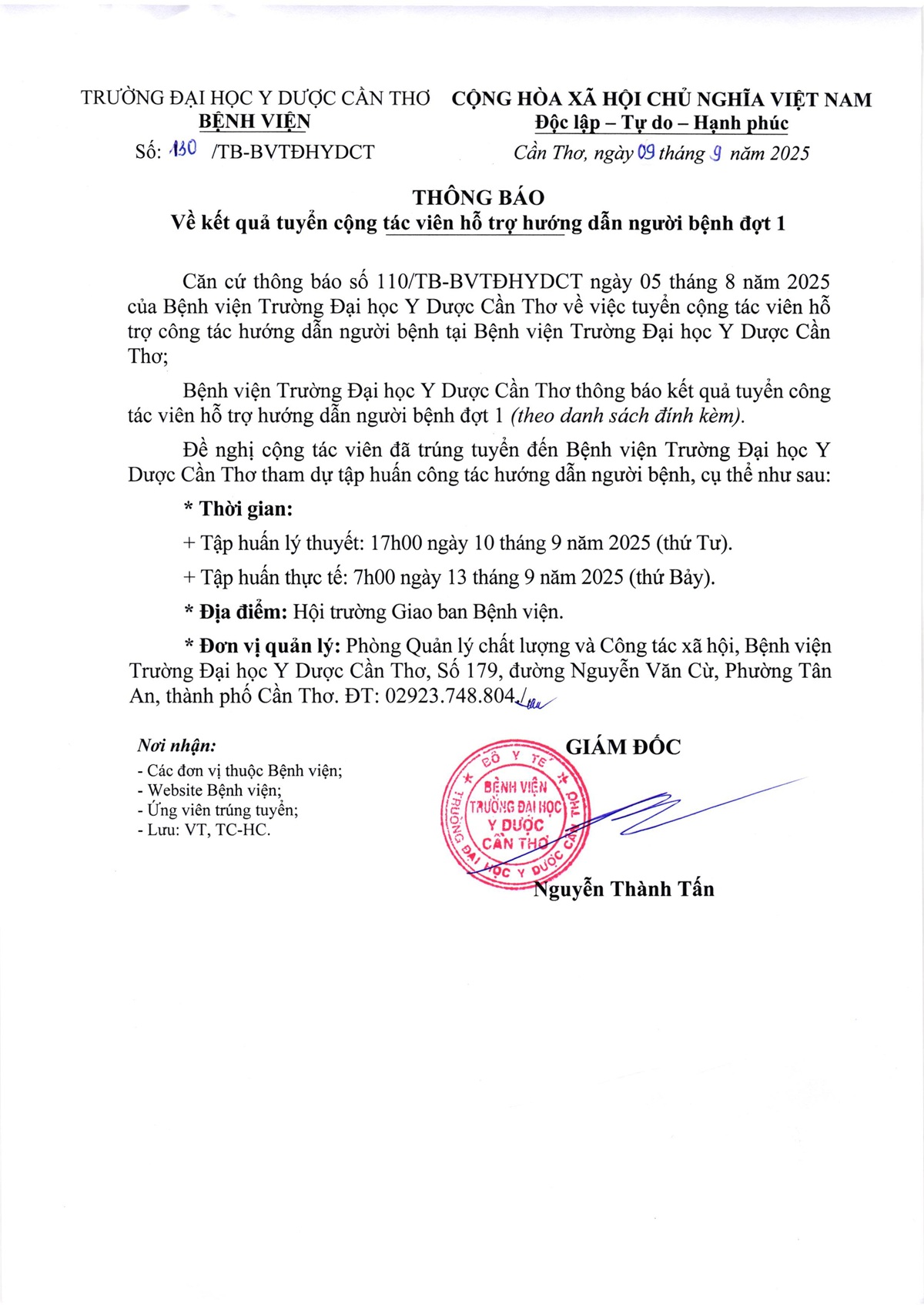 Thông báo số 130 kết quả tuyển dụng cộng tác viên hỗ trợ hướng dẫn người bệnh đợt 1