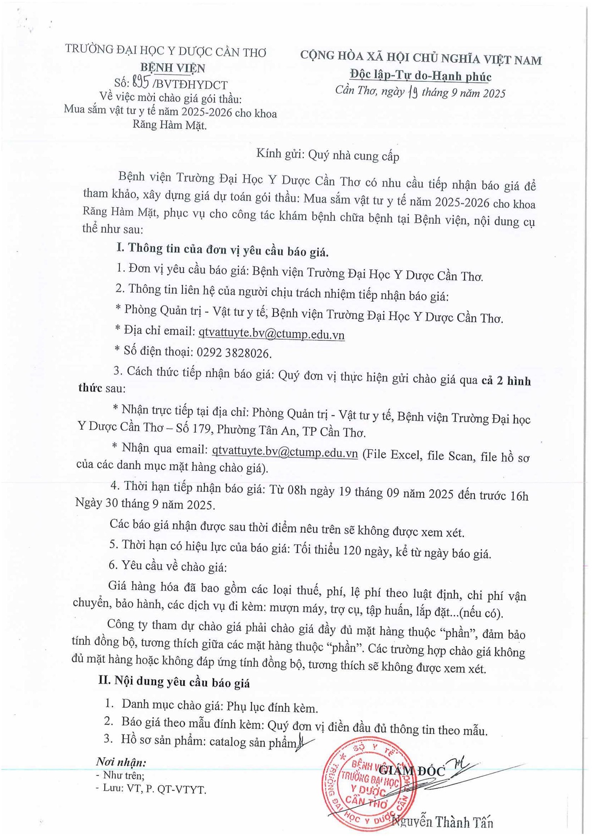 Về việc mời chào giá gói thầu: Mua sắm vật tư y tế năm 2025-2026 cho khoa Răng Hàm Mặt.