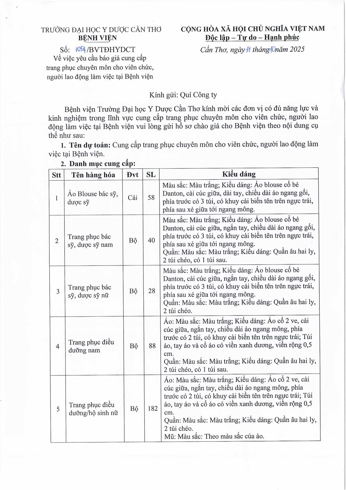 Về việc yêu cầu báo giá cung cấp trang phục chuyên môn, trang phục bảo hộ lao động cho viên chức, người lao động làm việc tại Bệnh viện