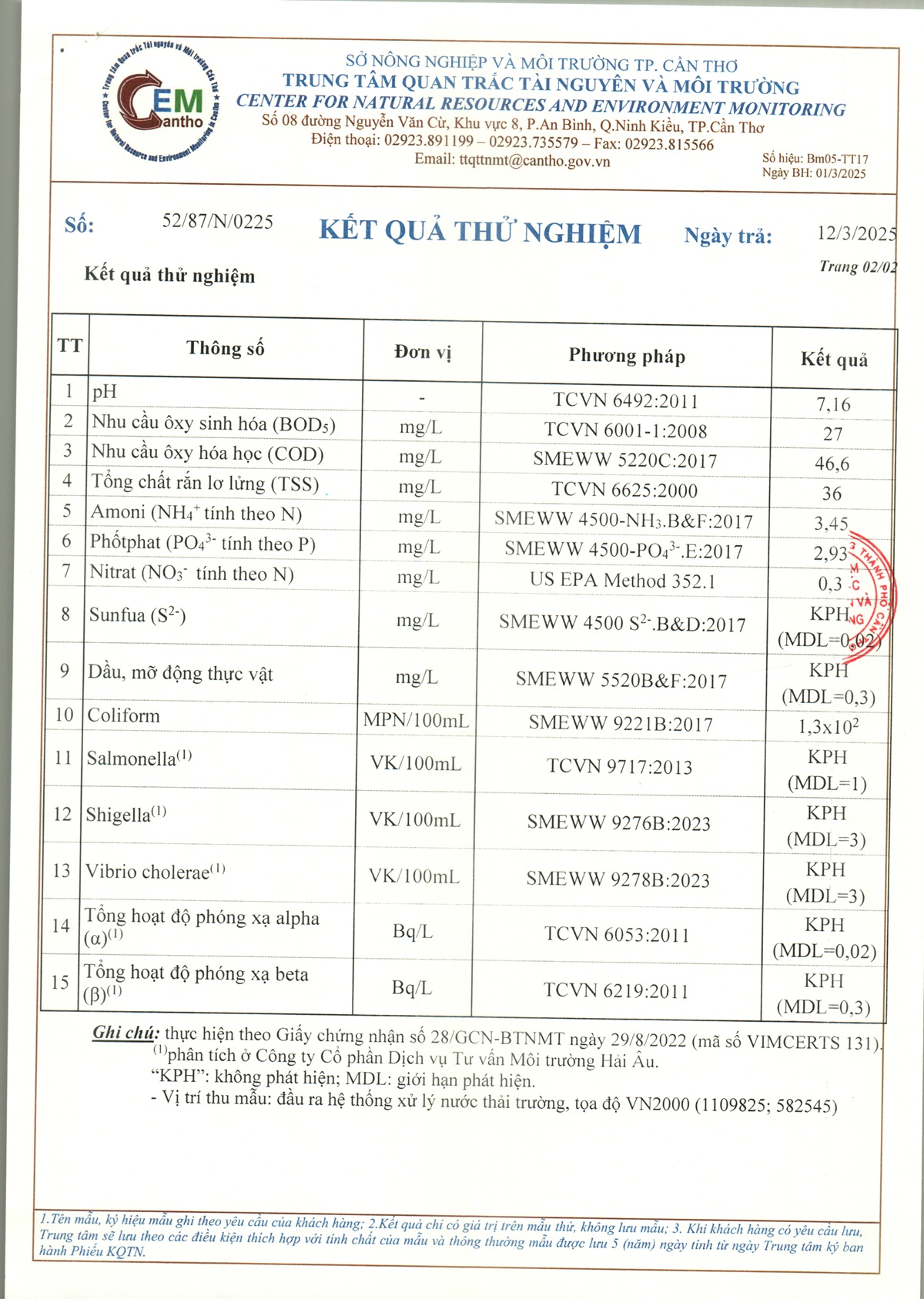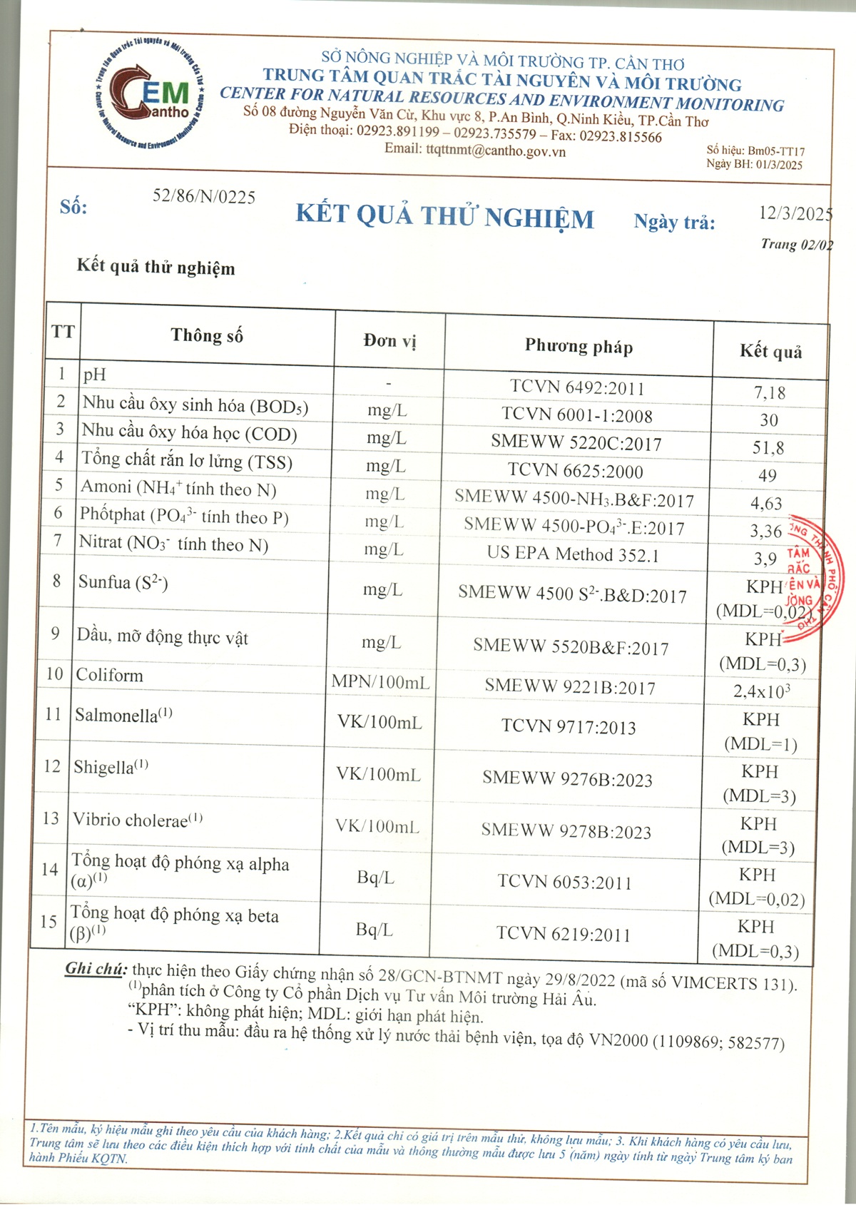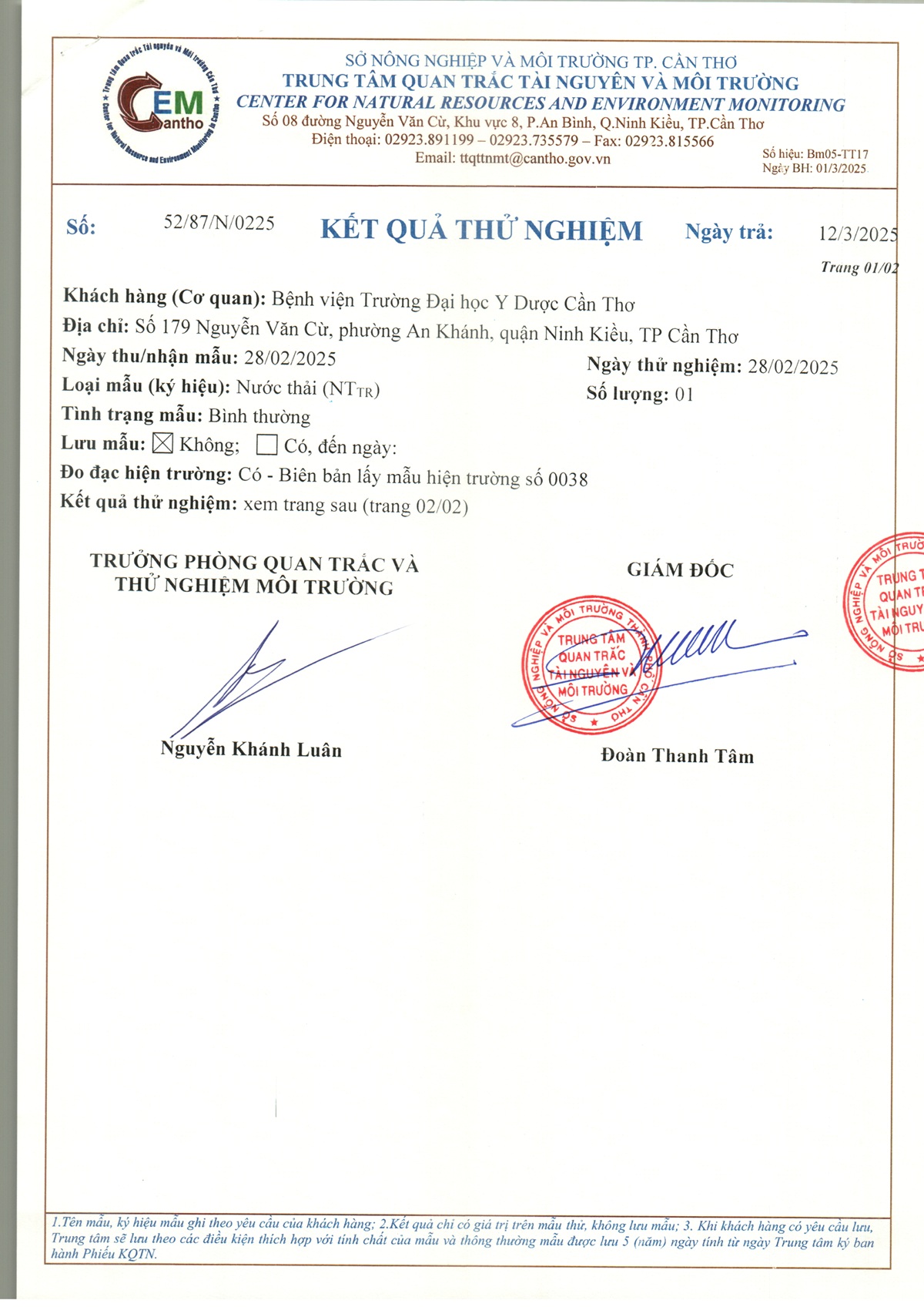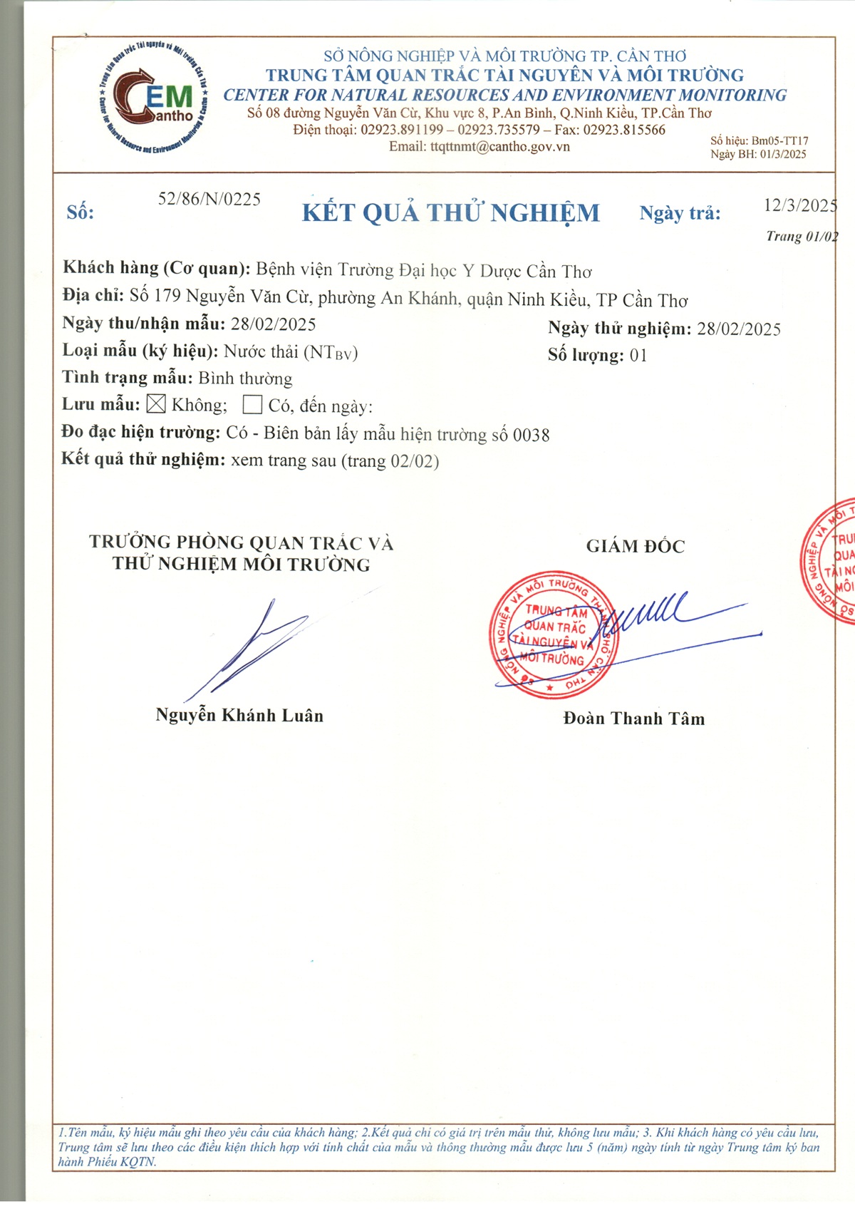 Kết quả quan trắc nước thải quý 1 năm 2025 của Bệnh viện Trường Đại học Y Dược Cần Thơ.