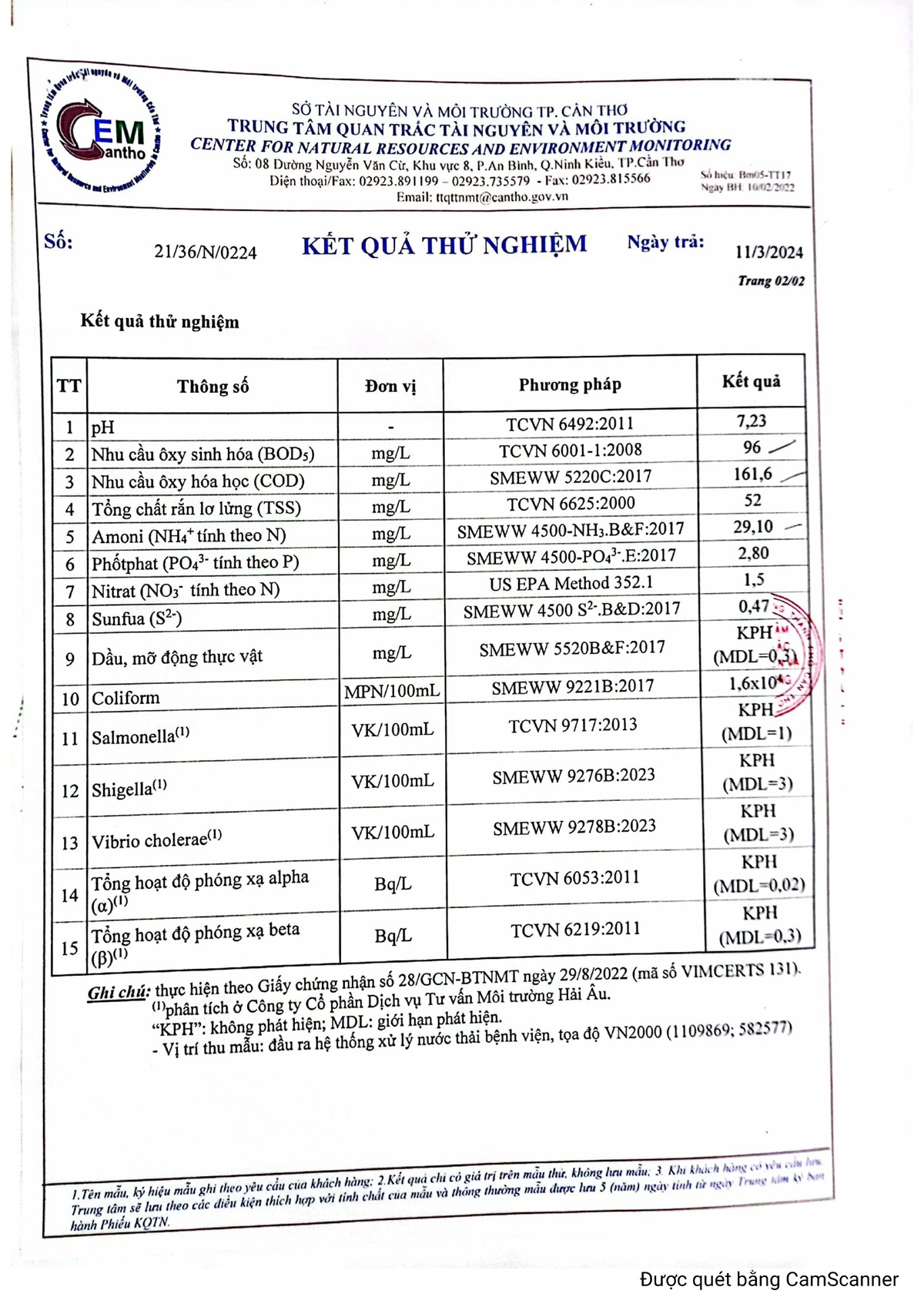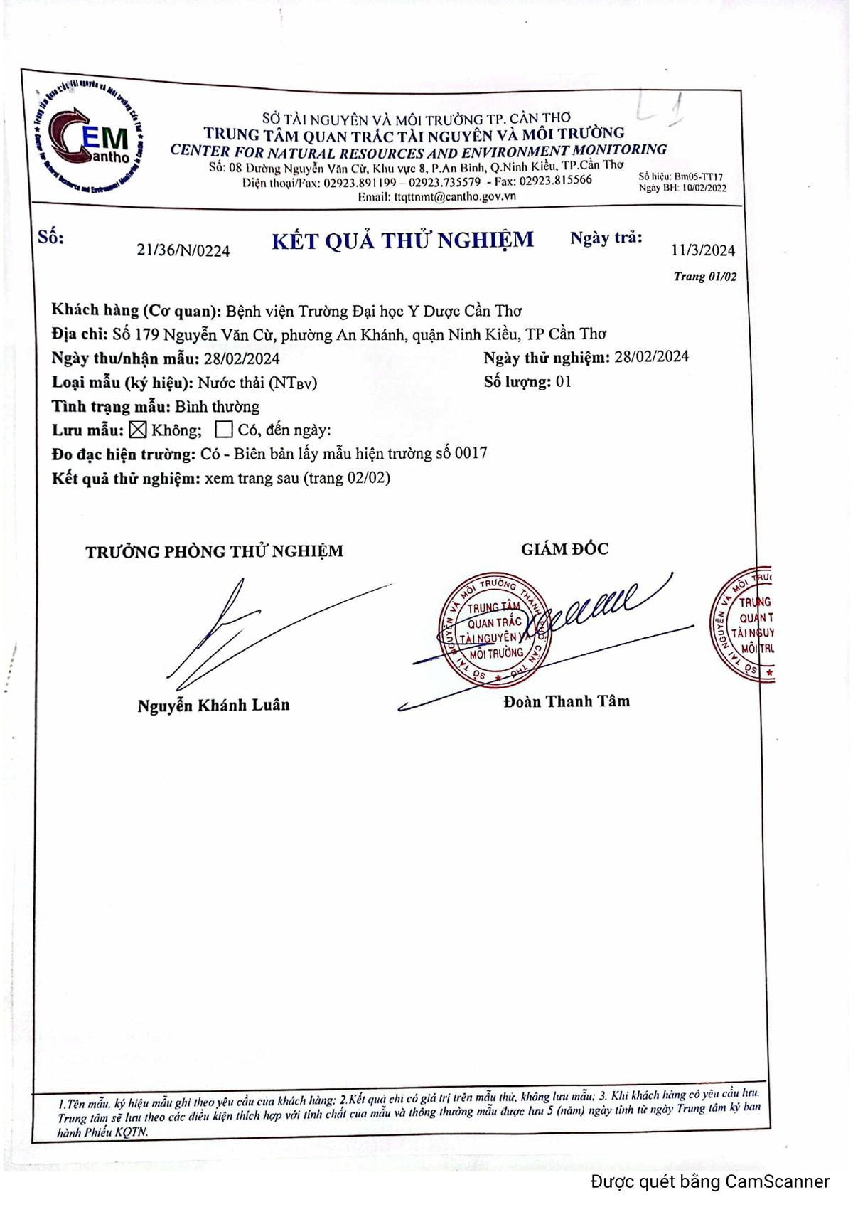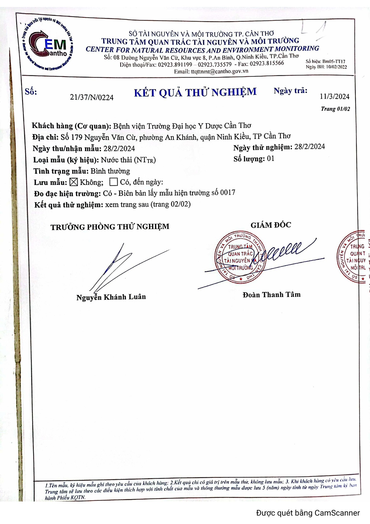 Kết quả quan trắc nước thải quý 1 năm 2024 của Bệnh viện Trường Đại học Y Dược Cần Thơ