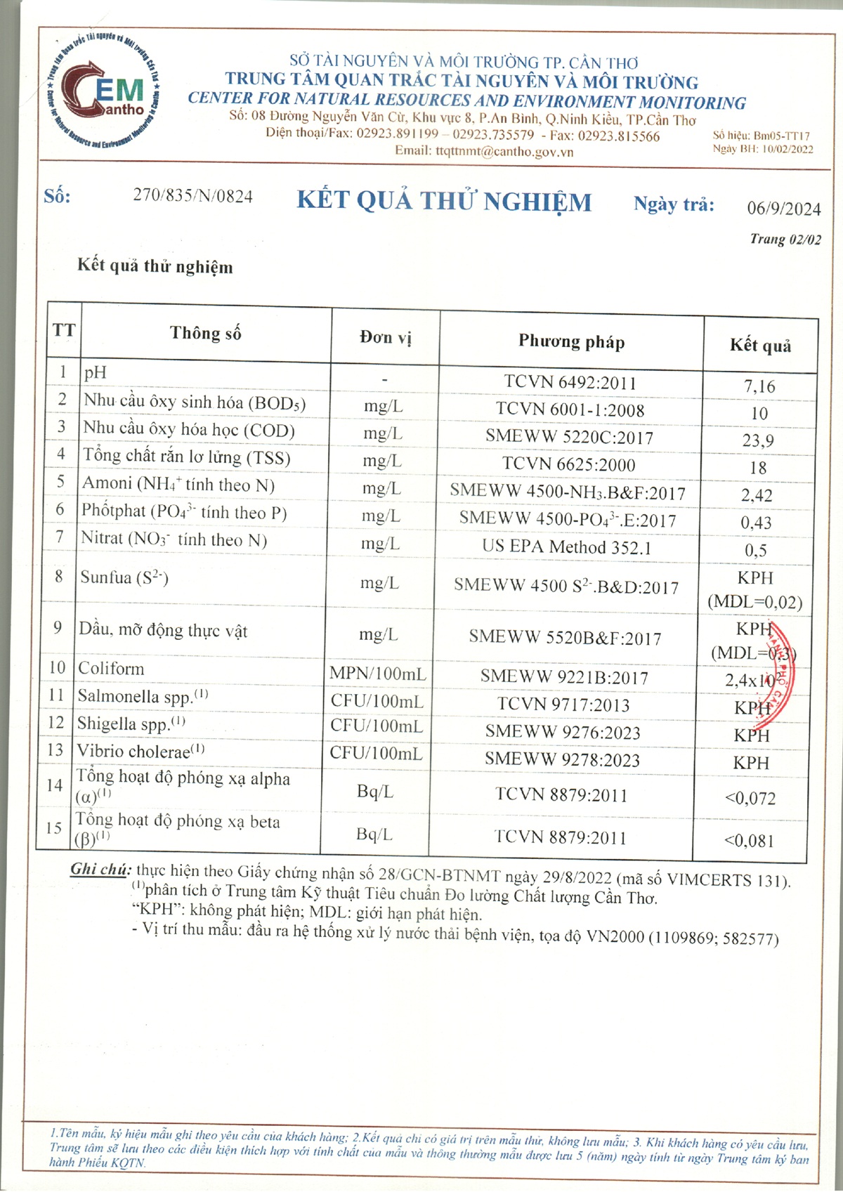 Kết quả quan trắc nước thải quý 2 năm 2024 của Bệnh viện Trường Đại học Y Dược Cần Thơ