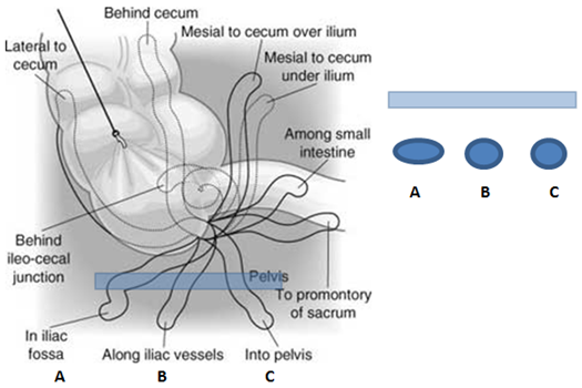 (2) Khi ruột thừa chạy vuông góc với đầu dò thì hình cắt ngang có khuynh hướng tròn hơn (vị trí B, C). Khi ruột thừa chạy hơi ngang so với đầu dò thì hình dạng sẽ dài hơn (vị trí A).
