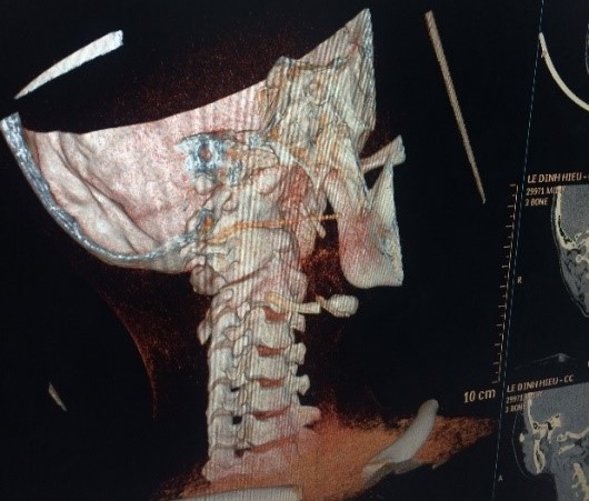 máu để có kế hoạch can thiệp và cấp cứu thích hợp. Kết quả CT-Scan dị vật nằm ở vùng vị trí hết sức nguy hiểm,