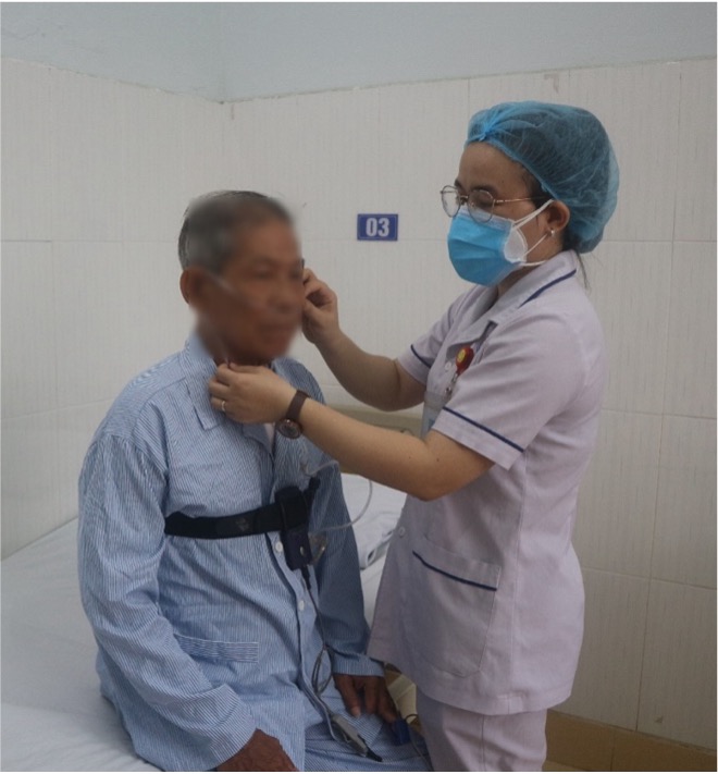 Điều dưỡng Trát Quốc Trung và điều dưỡng Đỗ Thị Thanh Trà đang tiến hành lắp đặt máy đo đa ký hô hấp cho bệnh nhân nhằm chẩn đoán hội chứng ngưng thở tắc nghẽn khi ngủ.