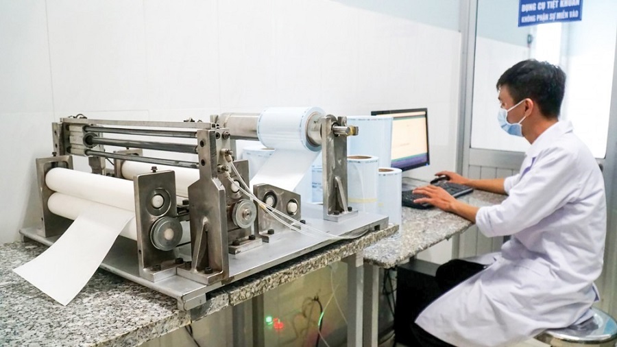 Hình 1. Lê Minh Khôi đang vận hành máy cắt túi ép tự động
